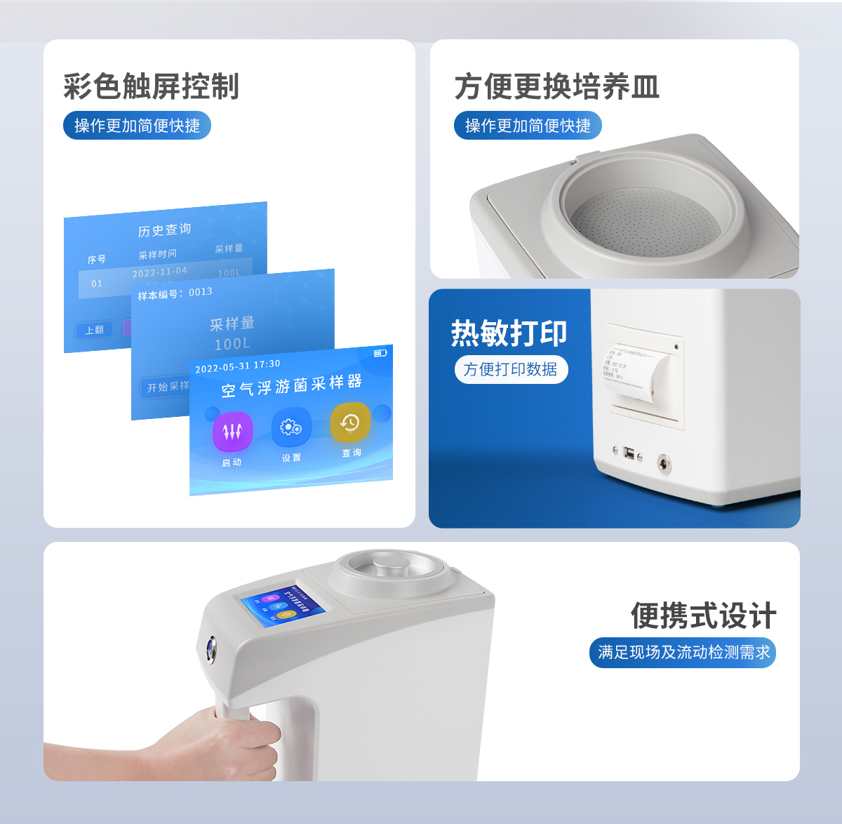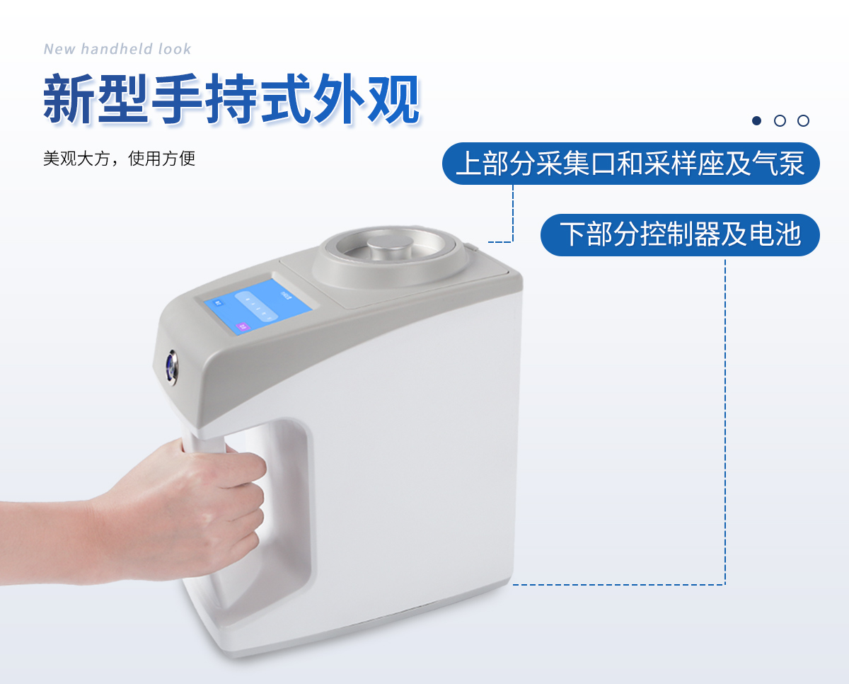●新型手持式外觀,美觀大方,使用方便。    ●彩色觸屏控制,操作更加**快捷。    ●LCD顯示采樣量,采樣時間等參數。    ●可將采樣量,采樣時間等參數按組儲存。    ●更換培養皿簡便,拿下采樣口即可更換培養皿。    ●帶熱敏打印機,方便打印數據。    ●帶上位機軟件,數據可導出電腦,方便歷史分析。    ●交直流兩用,內置6000mAh大容量鋰電池,可連續采樣8小時。    ●程序支持中文或英文。