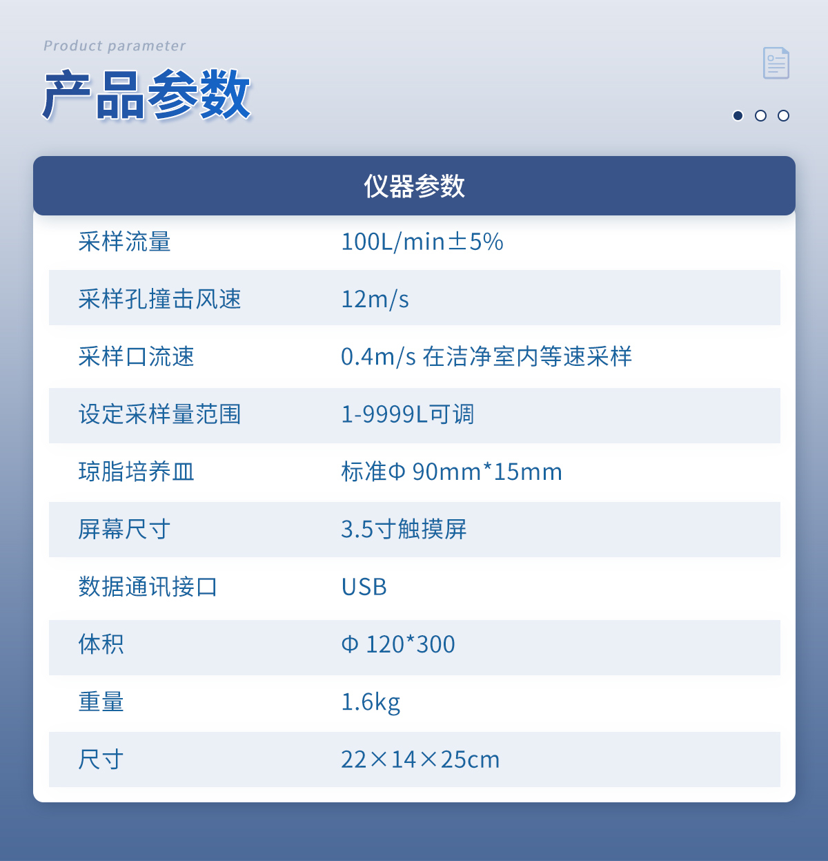 采樣流量:100L/min±5%    采樣孔撞擊風速:12m/s    采樣口流速:0.4m/s 在潔凈室內等速采樣    設定采樣量范圍:1-9999L可調    瓊脂培養皿:標準? 90mm*15mm    屏幕尺寸:3.5寸觸摸屏    數據通訊接口:USB    體積:Φ 120*300    重量:1.6kg    尺寸:22×14×25cm