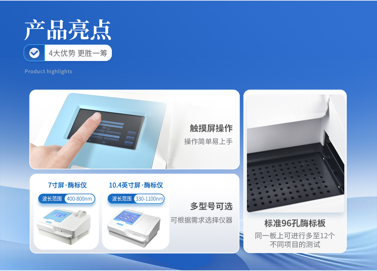 | *10.4英寸彩色液晶觸摸屏輸入,大屏顯示,操作快捷; | *全屏顯示96孔可視化布板操作界面; | 自動儲存標準曲線,用戶可對標準曲線進行修正; | 內置嵌入式系統,無需外接電腦即可操作、存儲、打印; | 單波長和雙波長測試模式下均可進行自動調零; | 可選配外接PC軟件,網絡化支持,迎合數字化發展方向,可定制上傳; | *海量存在,至少可儲存100萬板(96)測試數據及500個編程項目,并支持數據備份恢復合并; | *在同一板上可進行24個不同項目并可用顯示區分的測試,并可同一板檢測定性和定量項目; | *模板功能,固定檢測工作,極大簡化操作人員工作量; | 智能計算測試結果,確保測試結果的準確有效,并可自動報警; | 全新Windows彩色圖形化界面,全中文操作系統,支持鼠標、鍵盤,支持多種輸入法; | 光源智能開關,延長其壽命; | *全面完善的質控功能,包含westguard多規則質控,即刻法質控等多種質控圖及質控參數計算,具有質控報警功能; | 提供多種打印方式及多種形式中文報告,并可定制各式報告; | *布板和保存導入功能,大幅提高常用項目的測試效率; | *可選擇吸光度、Cut-Off定性計算、單點定標、折線回歸、線性回歸、指數回歸、對數回歸、雙對數回歸、log-logit、冪回歸、四參數回歸、酶抑制率等計算方法; | 專用系統維護菜單,自動判斷儀器當前狀態及性能指標,并可打印相關數據; |