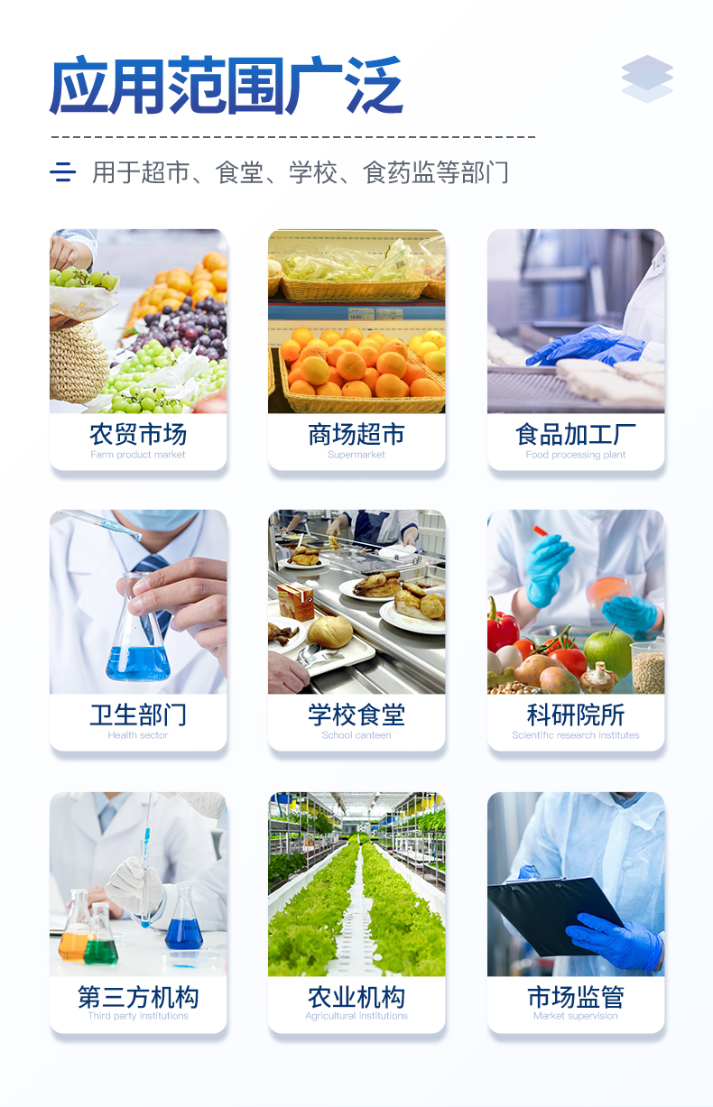 廣泛應用于主要用于蔬菜、水果、茶葉、糧食、農副產品等食品中有機磷和氨基甲酸酯類農藥殘留的快速檢測;此外還可用于果蔬茶生產基地和農貿批發銷售市場現場檢測,餐館、學校、食堂、家庭果蔬加工前的安全速測等。