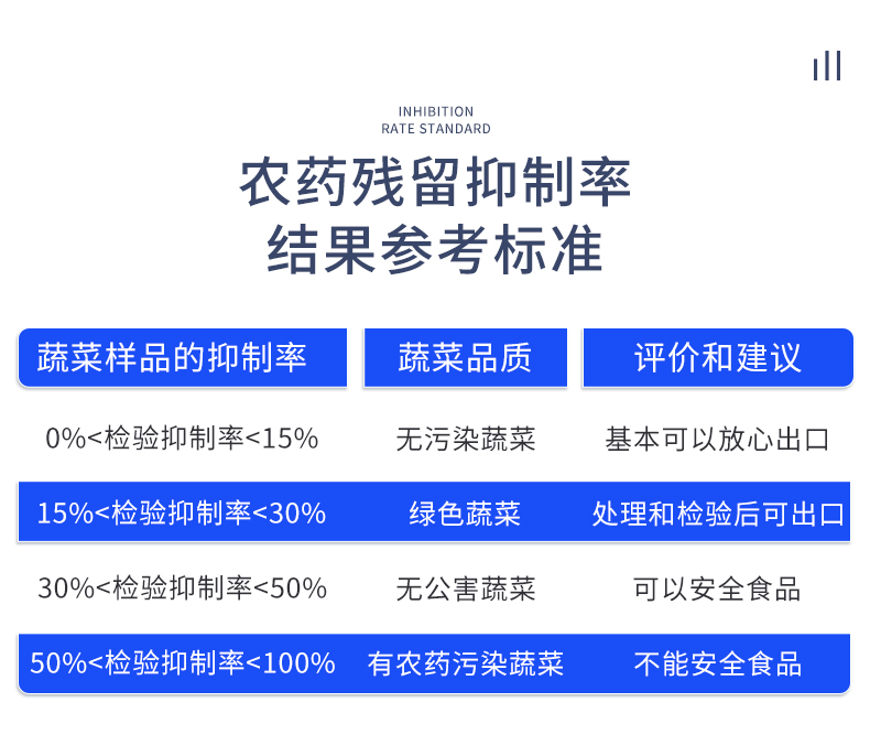 檢測標準:依據國家標準方法(GB/T5009.199-2003)以及世界衛生組織WHO、世界糧農組織FAO殘留農藥檢測標準、世界環境保護局EPA參照攝入量等要求來設計。采用酶抑制率比色法對水果、蔬菜等農林產品中有機磷和氨基甲酸酯類農藥含量進行快速準確的檢測。
