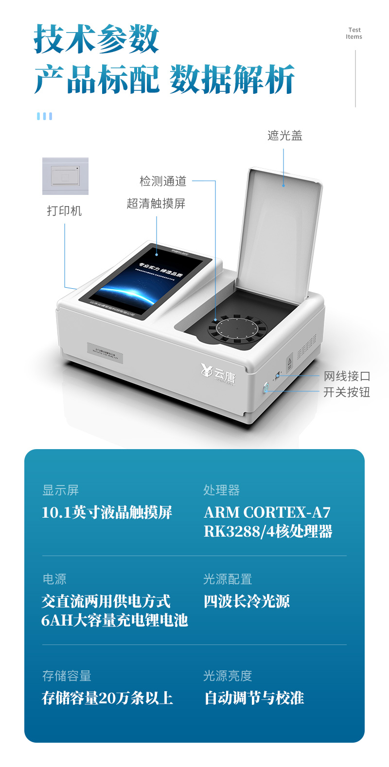 3、顯示屏幕:儀器采用10.1英寸豎向液晶觸摸屏顯,搭配運(yùn)行安卓智能操作系統(tǒng),主控芯片采用ARM Cortex-A7,RK3288/4核處理器,主頻1.88Ghz,操作方便,性能更強(qiáng)。