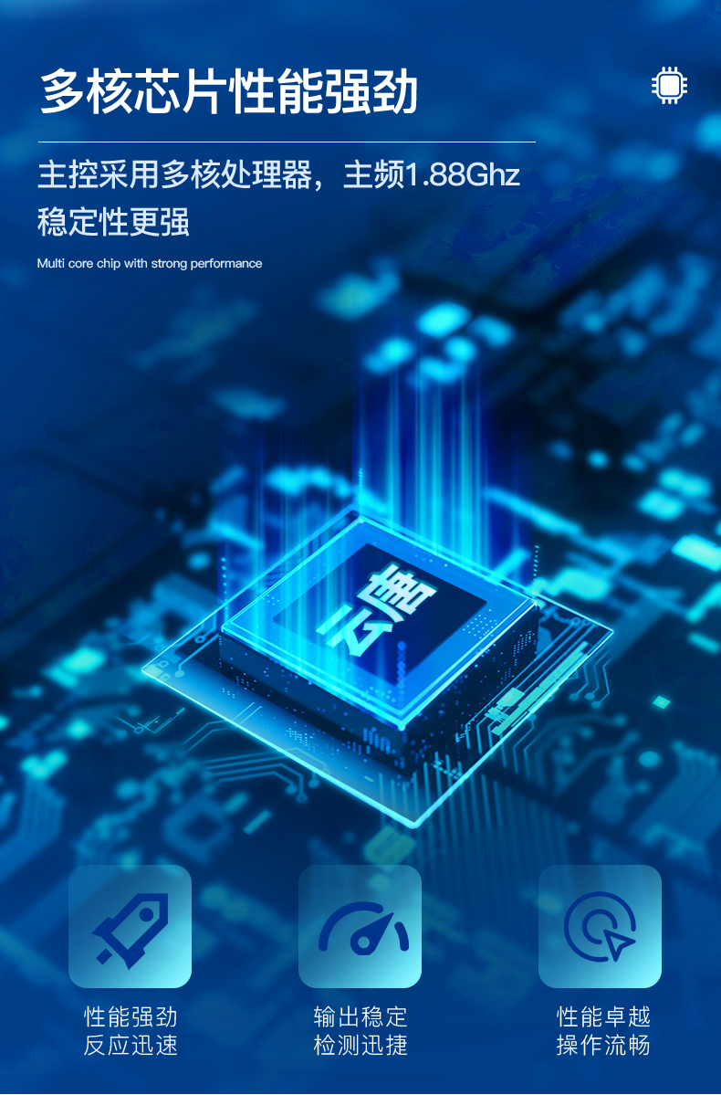 1、儀器采用10.1英寸液晶觸摸屏顯,搭配運(yùn)行安卓智能操作系統(tǒng),主控芯片采用ARM Cortex-A7,RK3288/4核處理器,主頻1.88Ghz,運(yùn)轉(zhuǎn)速度更快速,性能更強(qiáng)。