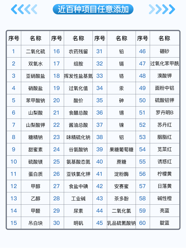 1、食品添加劑:二氧化硫、雙氧水、亞硝酸鹽、硝酸鹽、苯甲酸鈉、山梨酸鉀、糖精鈉、甜蜜素、硫酸鎂等;
