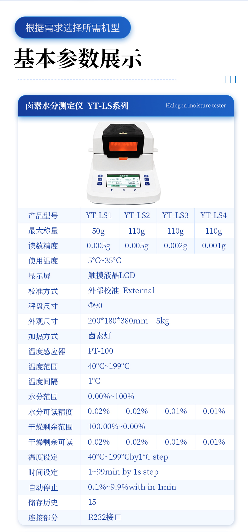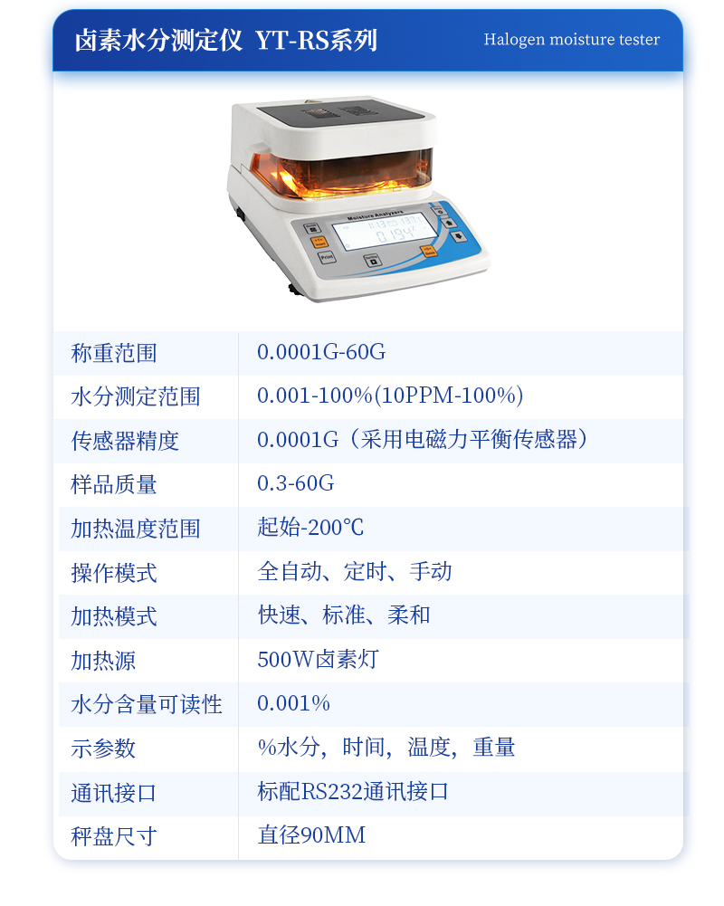 該系列快速水分測定儀應用了國際烘箱干燥法原理,測定結果與烘箱法水分測定具有良好的一致性,工作效率卻遠遠高于烘箱法水分測定,一般樣品只需要幾分鐘即可測量完畢,因此受到廣大用戶的青睞與好評。