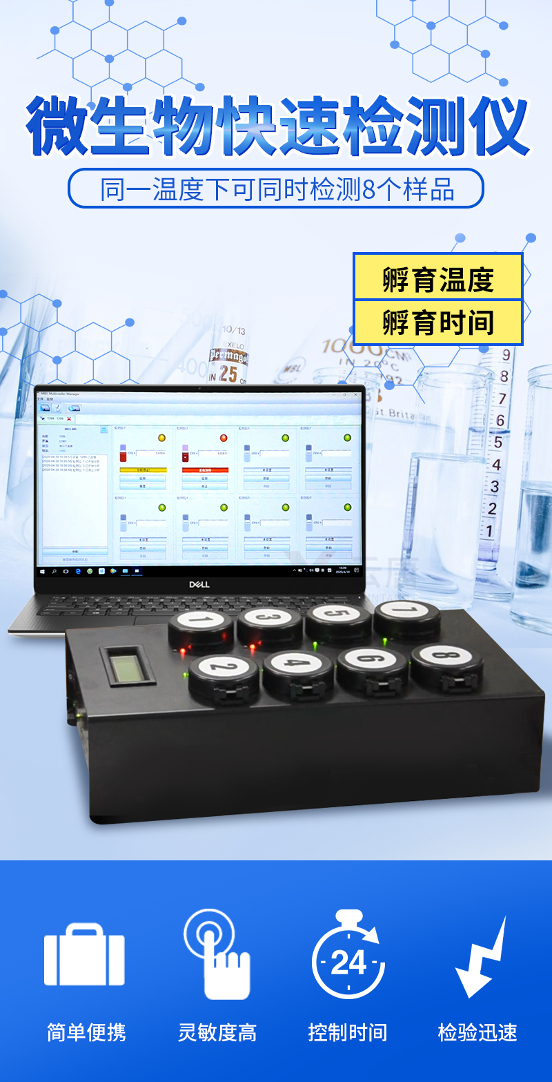 微生物細菌檢測儀檢測樣本只需1ml/1g;同一溫度下可同時檢測8個樣品. 熱線:133-7109-8225 二維碼